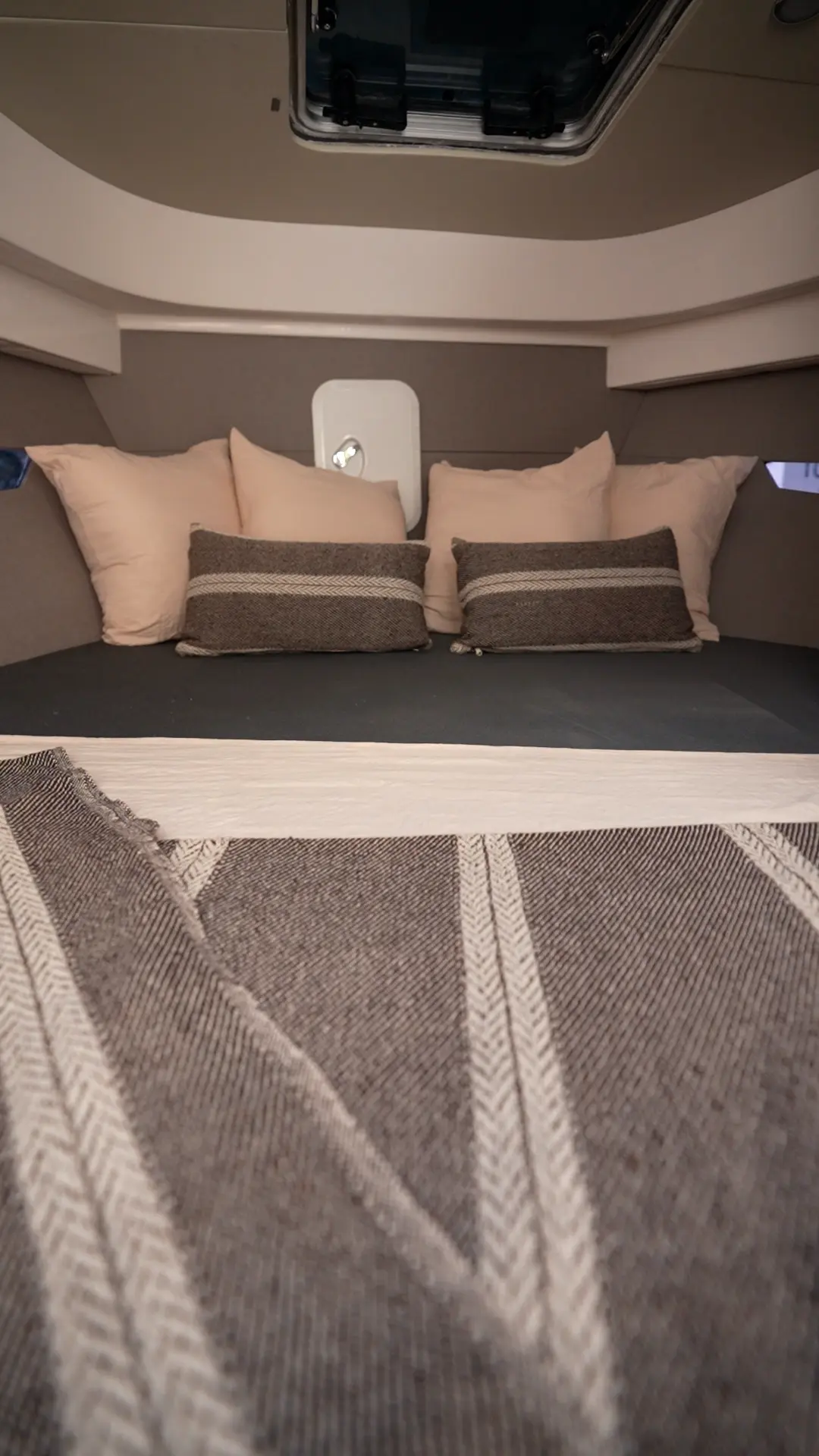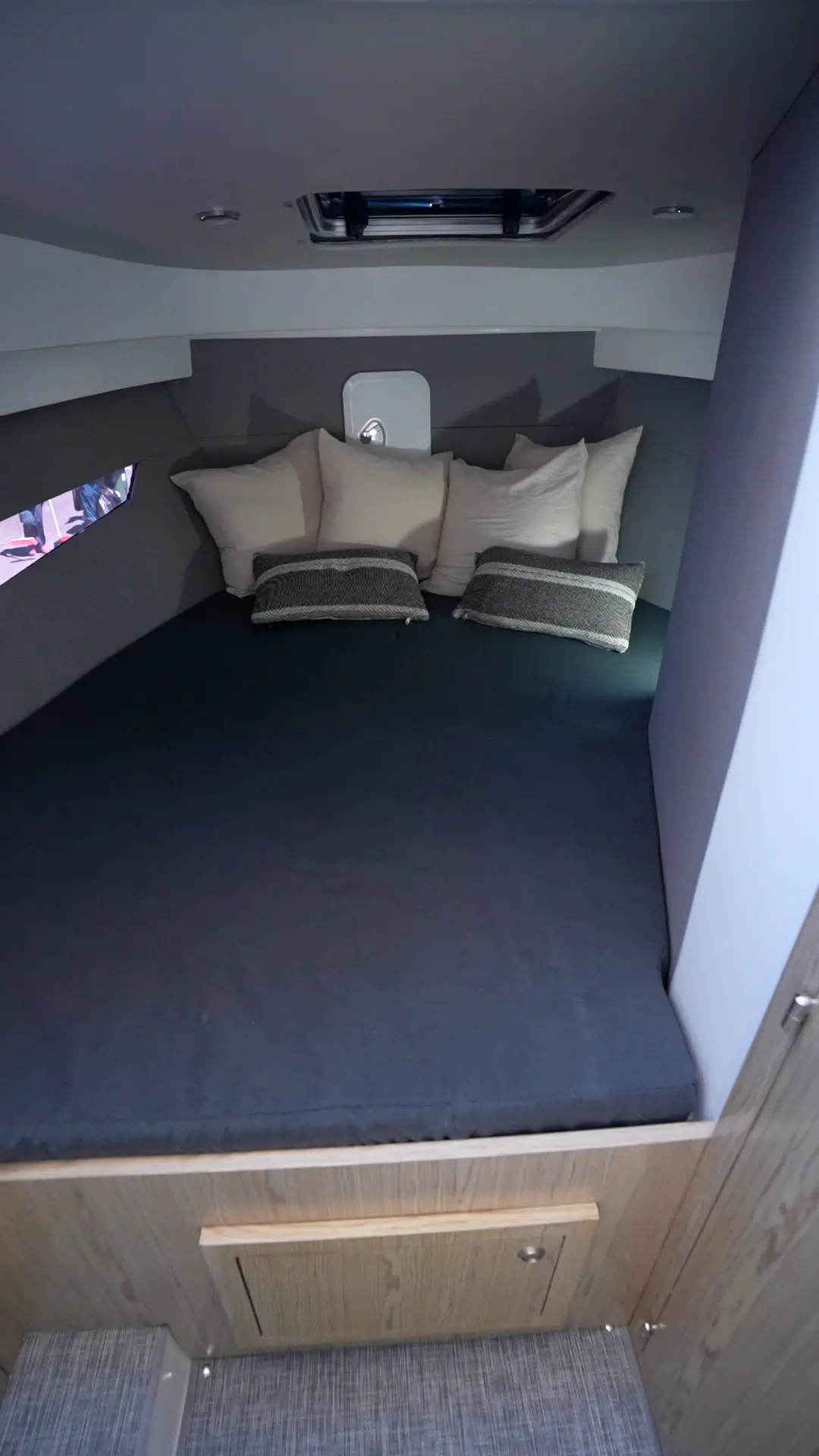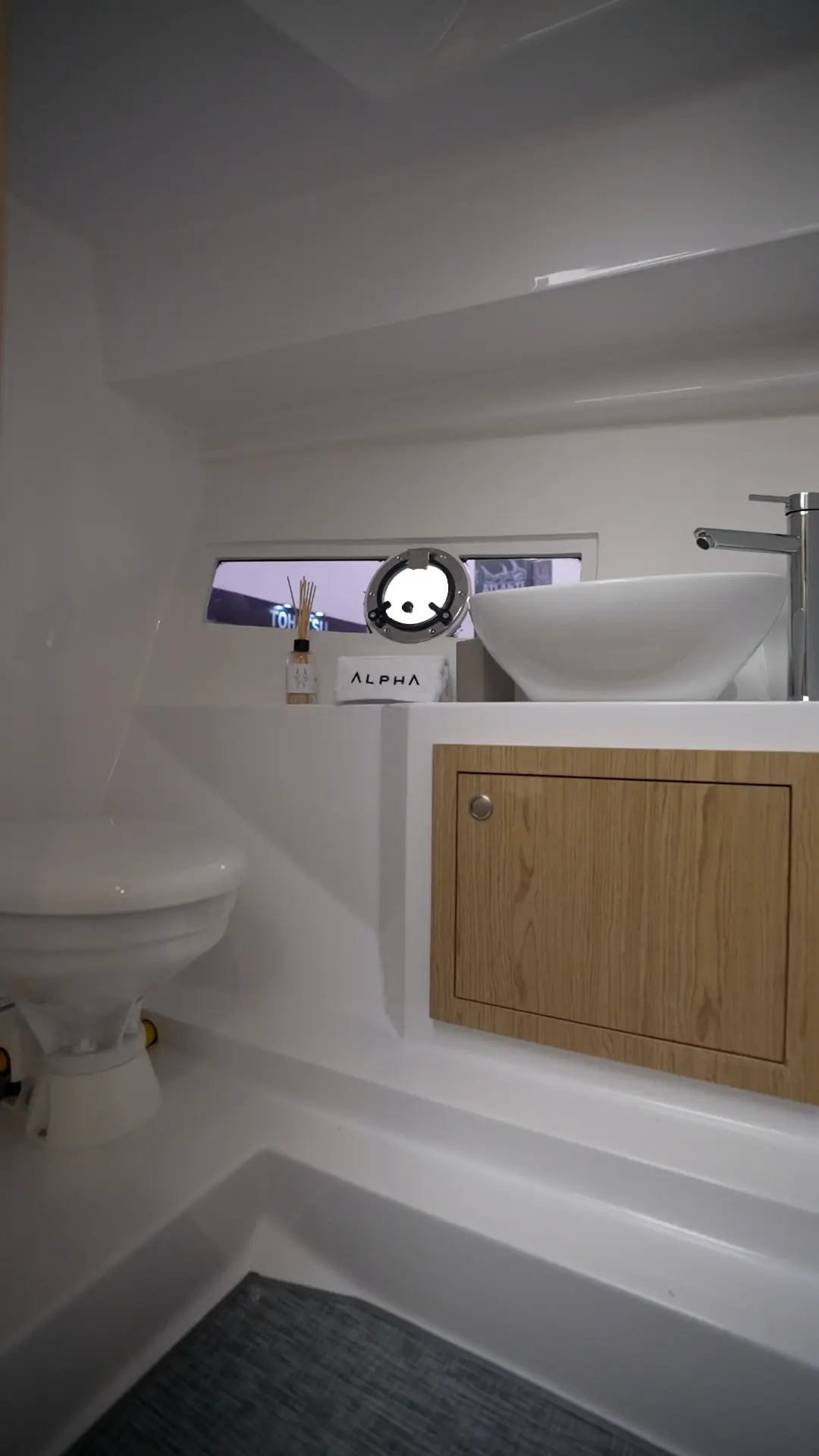 Towards the bow, we find a very spacious bathroom with great interior height, a large double bed in the bow, and access to the forepeak, creating a bright space thanks to the hull windows, a distinctive feature of the design.